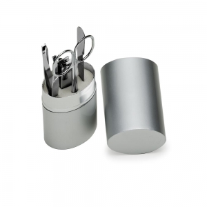 Kit manicure 5 peças em estojo oval de alumínio. Possui lixa, tesoura, pinça, empurrador de cutícula e cortador de unha.
