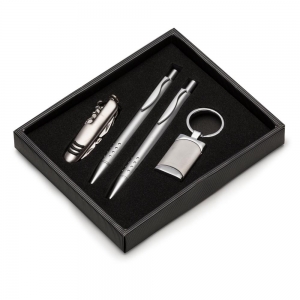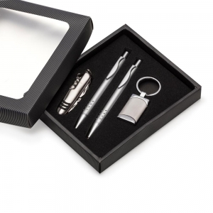Kit executivo com 4 peças em estojo de papelão com visor plástico. Possui uma caneta e lapiseira prata em metal com vinte e quatro furos na parte inferior, acionam por clique. Chaveiro metal retangular com chapa central fosca e verso brilhante. Canivete metal 7 funções com detalhes emborrachados preto(três linhas frente e verso). Possui: lâmina de corte, mini tesoura, abridor de lata, abridor de garrafa, chave phillips, lixa e saca rolhas.