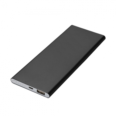 Power bank de metal com indicador de carga em led. Corpo metálico de design fino com detalhe branco nas laterais, “entrada” e “saída” de 5v, 4 indicadores de carga em led branco e botao liga/desliga, 2800 mAh. Acompanha cabo USB.