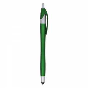 Caneta plástica com ponteira touch, inteira colorida com detalhes prata. Aciona por clique, ponteira sai através da borracha touch.