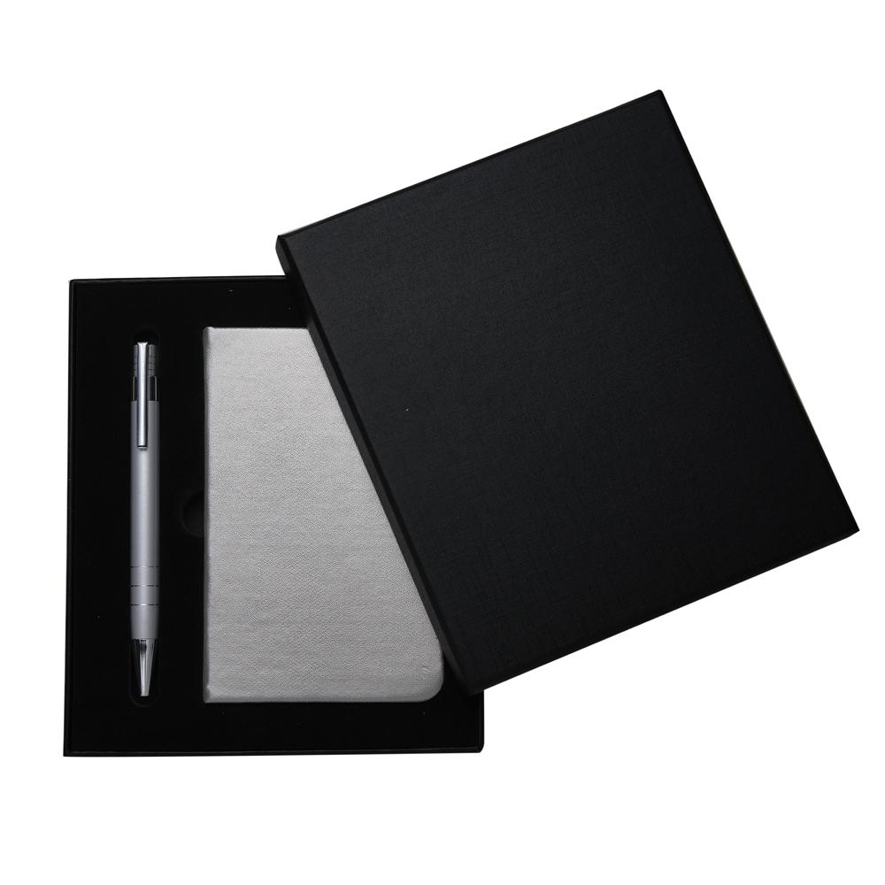 Conjunto caneta e caderneta tipo moleskine, embalagem de papelão revestido com espuma internamente. Caneta semi-metal colorida com detalhes prata, possui 3 anéis superiores e inferiores, clip de metal e aciona por clique. Caderneta couro sintético com textura na capa, possui folhas amarelas pautadas com aproximadamente 80 páginas.