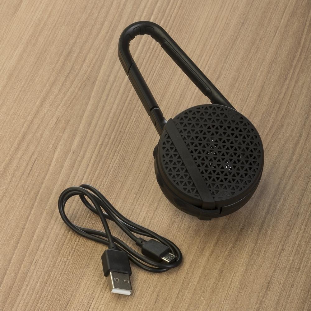 Caixa de som bluetooth com mosquetão. Material plástico, parte frontal com “tela” vazada, verso liso, abaixo do botão Power possui um indicador de funcionamento em Led azul. Botão Power: ao segurá-lo irá ligar/desligar a caixinha, ao pressioná-lo irá reproduzir/pausar a faixa e no modo ligação ao pressioná-lo irá atender/desligar a chamada;ao segurá-lo irá avancar a faixa Botão + ao pressioná-lo irá aumentar o volume, ; Botão – ao pressioná-lo irá abaixar o volume, ao segurá-lo irá retroceder a faixa. Auto-falante saída RMS: 3W @ 10%; SNR: 65db @ 1W; THK: 10% no volume máximo; Resposta de frequência: 130Hz-20kHz; Bluetooth 2.1; Perfis suportados: A2DP, AVRCP, HFP; Alcance 10m; Corrente de entrada: 5V, 300mA; Bateria de Lítio 350mAh 3.7V; Microfone acoplado; Duração da bateria aproximadamente 2 horas. Acompanha cabo USB.