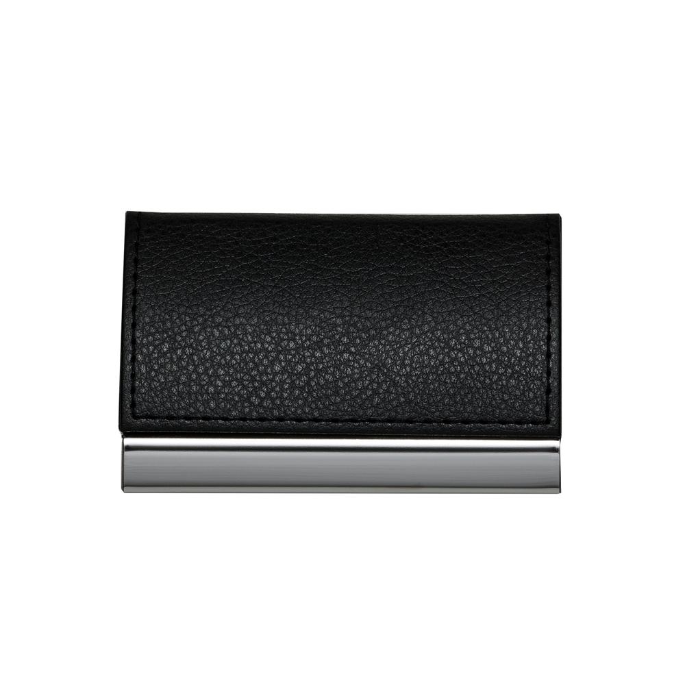 Porta cartão de metal com couro sintético. Couro com textura e costura preta, parte interna revestida com veludo.